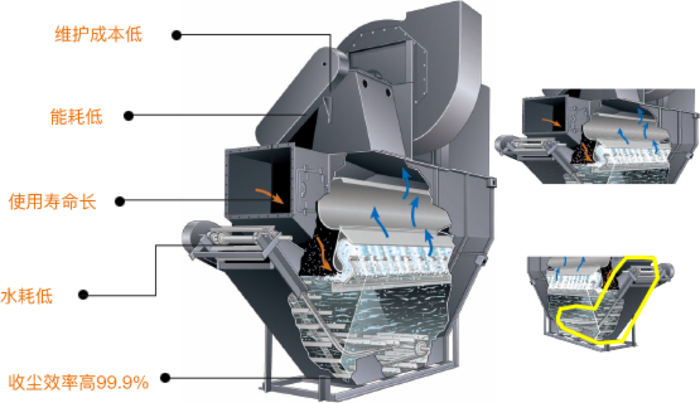 维护运行成本低,无需更换过滤材质,仅通过水作为降尘介质,且能实现水的循环利用,节约水资源。过滤效率高,粉尘过滤环节需经过多次、充分的水幕洗涤,排放气体过滤效率提高。能实现设备全程自动化,可根据系统要求自动启停,减少人工维护费用。让您车间的粉尘、